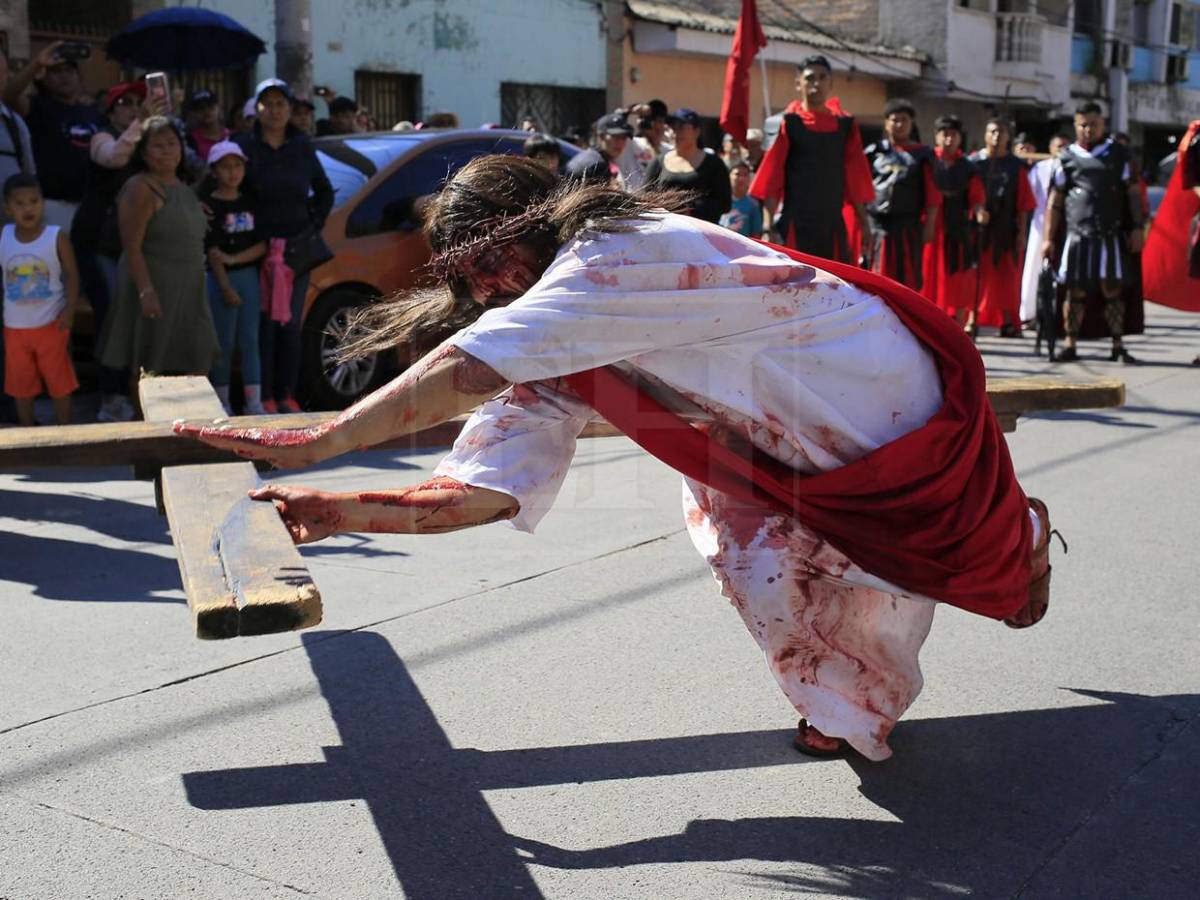 Una persona que representa a Jesús participa en el Vía Crucis de Semana Santa en Tegucigalpa es lanzado al suelo en su camino al Gólgota, recordando la pasión de Cristo. Esta es una compilación de las mejores imágenes de Semana Santa 2026.