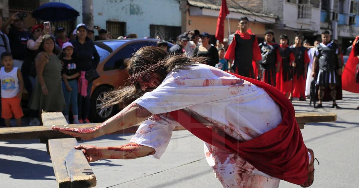Integrantes de la Iglesia El Calvario participan en el Vía Crucis de Semana Santa, representando fielmente cada papel.