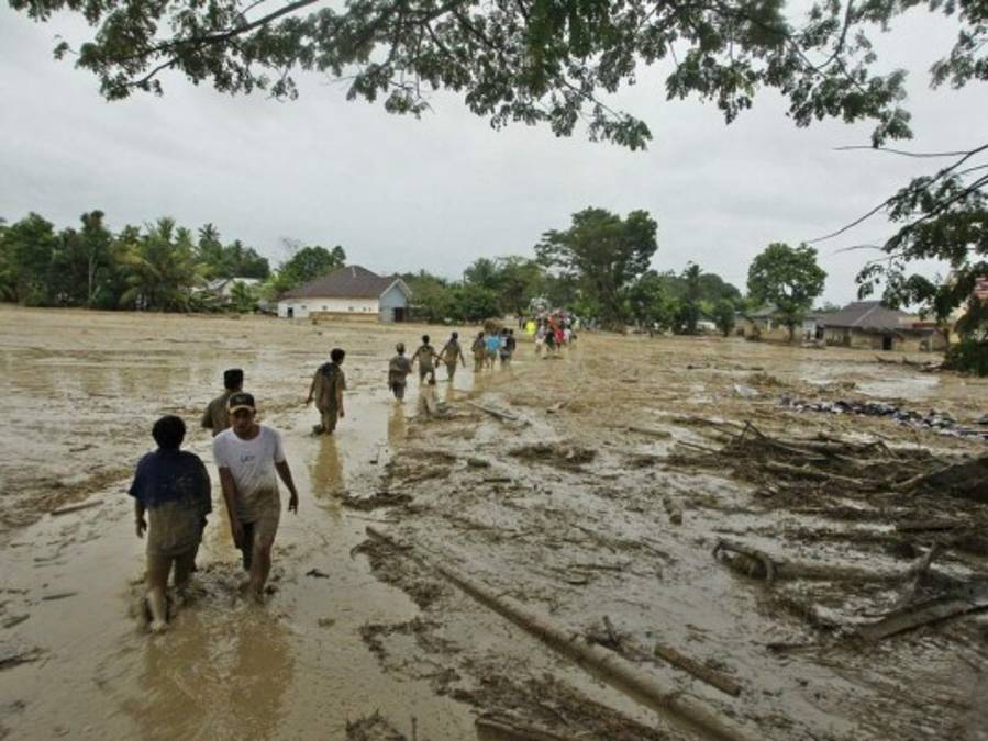 Unas personas caminan a través de lodo en una zona afectada por una inundación repentina en Célebes Meridional, Indonesia. Foto: AP 17/07/2020 - 00:007 / 16 -