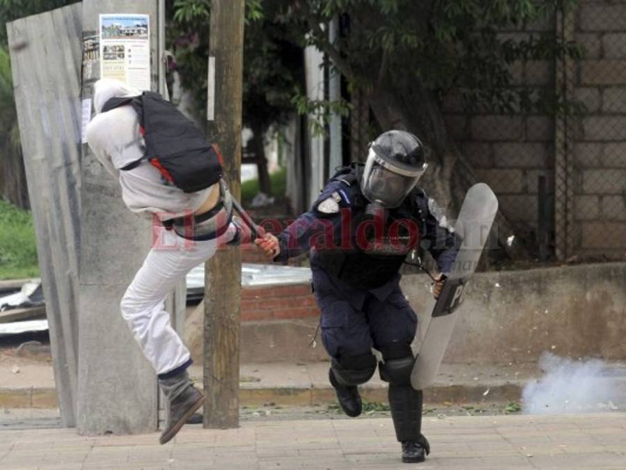 7. Batallas campales: Personas encapuchadas que protestaron en reiteradas ocasiones frente a la Universidad Nacional Autónoma de Honduras (UNAH) se enfrentaron a los miembros de la Policía Nacional. Los jóvenes y los policías convirtieron en varias ocasiones las inmediaciones de la alma máter en escenario de verdaderas batallas campales. Los uniformados intentaban desalojarlos a los manifestantes ya que generalmente mantenían tomados ambos carriles. Foto: Marvin Salgado. 30/12/2019 - 00:008 / 11 -
