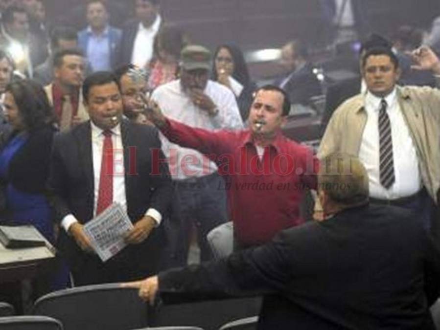 6. Zafarrancho de Libre en el CN: Miembros de la bancada del partido Libertad y Refundación (Libre) en el Congreso Nacional protagonizaron una serie de protestas dentro de la Cámara Legislativa en las que hasta explotaron petardos y sacaron sus pitos para demandar la inclusión de su partido en los nuevos entes electorales como el Consejo Nacional Electoral (CNE), Tribunal de Justicia Electoral (TJE) y el Instituto de Acceso a la Información Pública (IAIP). Foto: Marvin Salgado. 30/12/2019 - 00:007 / 11 -