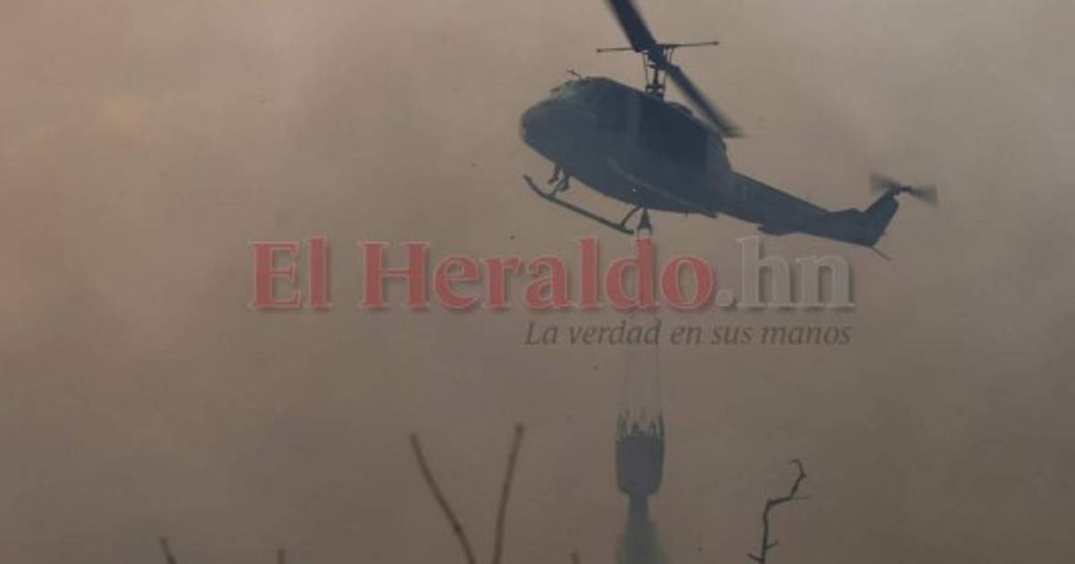 Un helicóptero de la Fuerza Aérea Hondureña (FAH) lanza agua desde el aire para apagar las llamas que consumen el bosque de la capital de Honduras. Foto: Emilio Flores/EL HERALDO. 19/03/2019 - 00:001 / 9 -