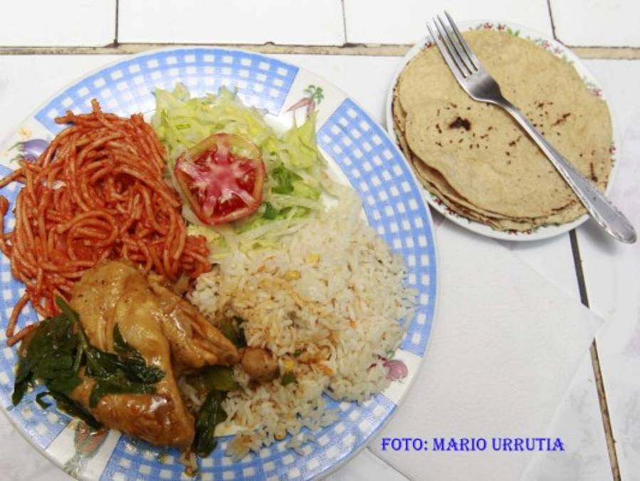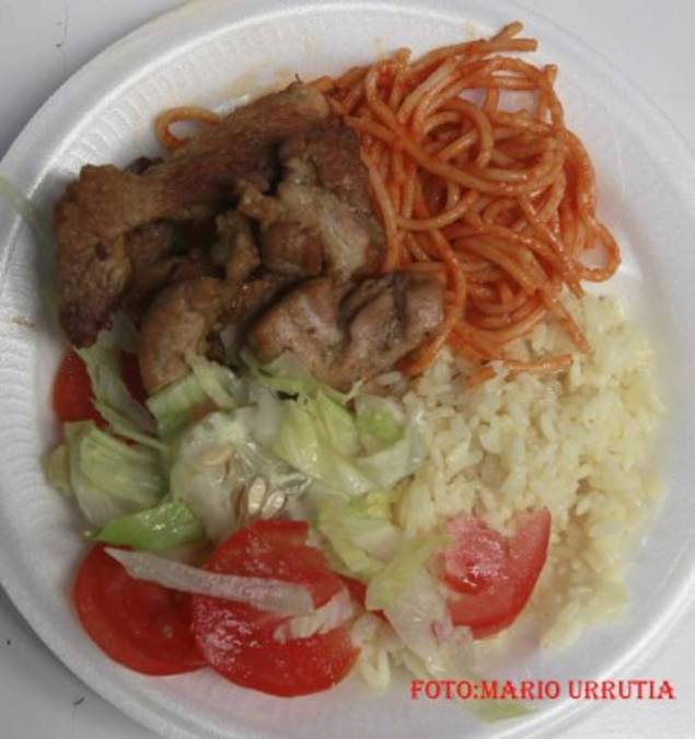 Comedor La Gemelas, Carne de cerdo frita, arroz, espaguetis ensalzados y ensalada de lechuga con pepino y tomate. (Foto: Mario Urrutia) 15/08/2015 - 00:002 / 11 -