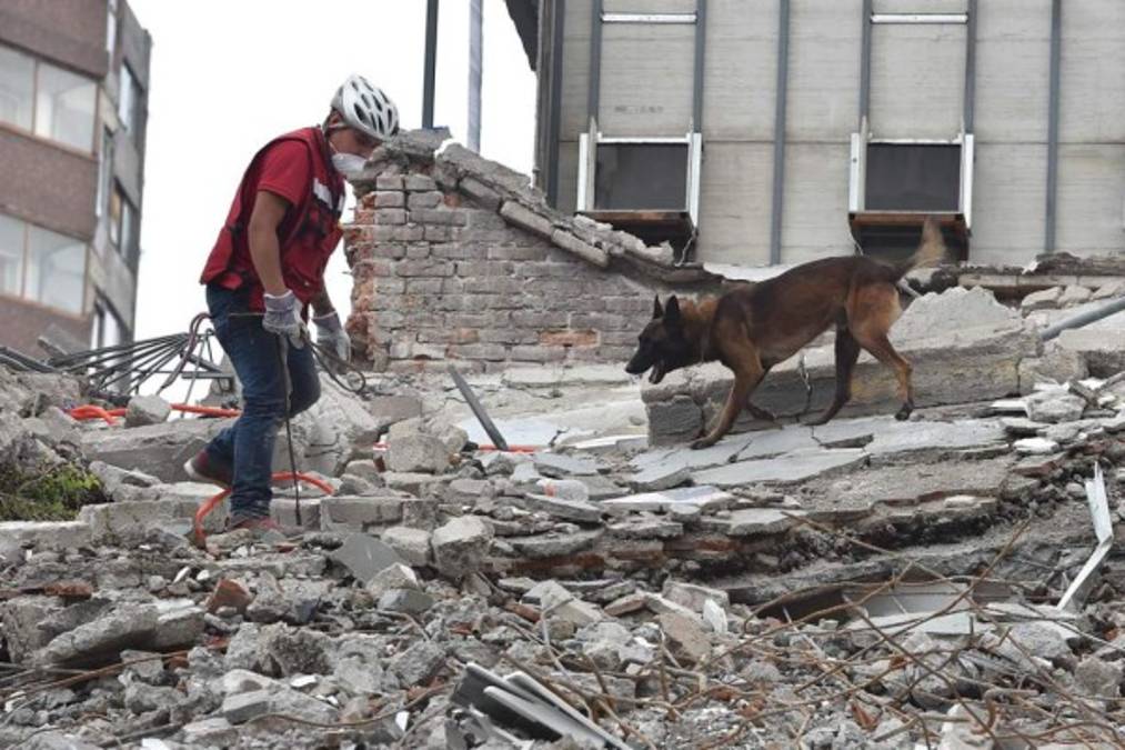 4. Miembros del Equipo Aéreo de Búsqueda y Rescate (SAR) participan en la búsqueda de sobrevivientes en un edificio aplanado en la Ciudad de México el 21 de septiembre de 2017, dos días después de un fuerte terremoto en el centro de México. Un poderoso terremoto de 7,1 sacudió la ciudad de México el martes, causando pánico entre los 20 millones de habitantes de la megalópolis en el 32 aniversario de un devastador terremoto de 1985. / AFP / Yuri CORTEZ. 21/09/2017 - 00:002 / 10 -