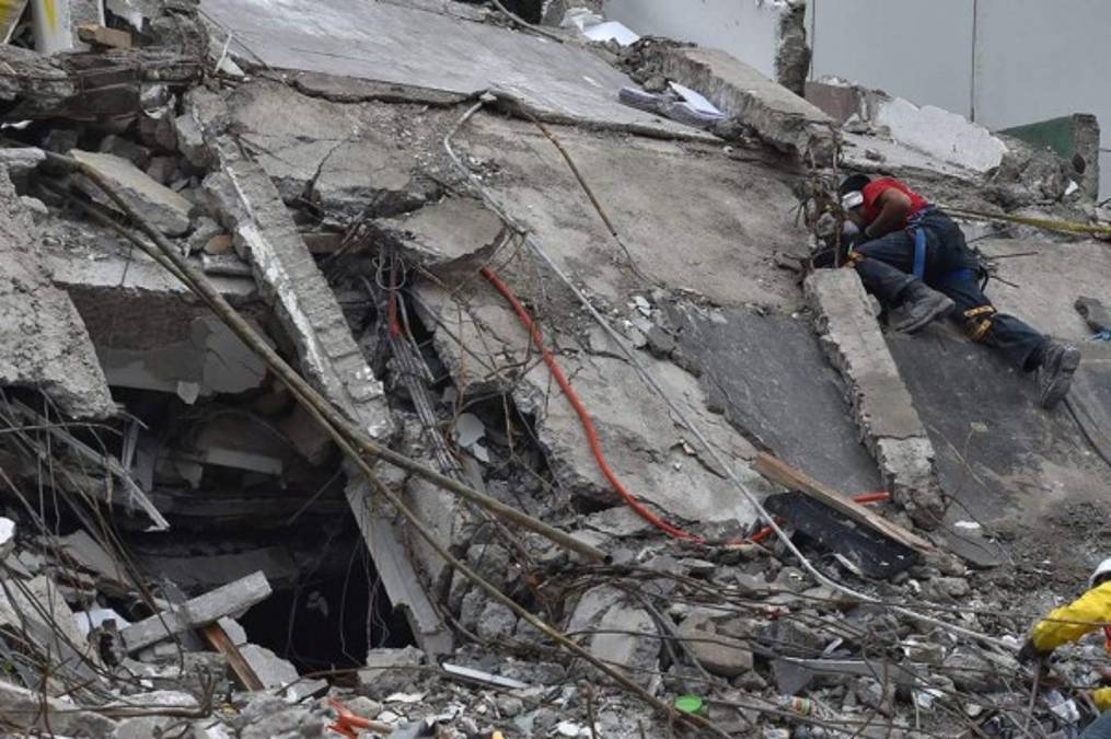 8. Un rescatista con un percusionista busca a sobrevivientes en un edificio aplanado en la Ciudad de México el 21 de septiembre de 2017 dos días después de un fuerte terremoto en el centro de México. Un poderoso terremoto de 7,1 sacudió la ciudad de México el martes, causando pánico entre los 20 millones de habitantes de la megalópolis en el 32 aniversario de un devastador terremoto de 1985. / AFP / Yuri CORTEZ. 21/09/2017 - 00:008 / 10 -