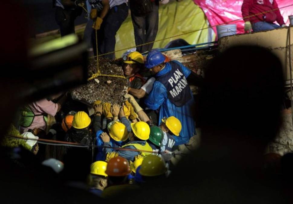 Equipos de búsqueda y rescate trabajan para derribar un gran pedazo de hormigón durante los esfuerzos de rescate en la escuela Enrique Rebsamen en la Ciudad de México, México, el jueves 21 de septiembre de 2017. Un delicado esfuerzo para llegar a una niña enterrada en los escombros de la la escuela se extendió en un nuevo día el jueves, una difusión de vigil en todo el país como trabajadores de rescate lucharon en la lluvia y la oscuridad para recoger desechos inestables y llegar a ella. (AP Photo / Anthony Vazquez). 21/09/2017 - 00:004 / 10 -
