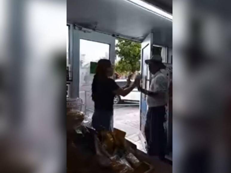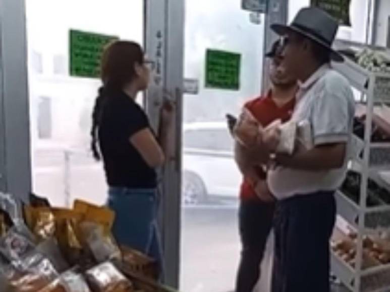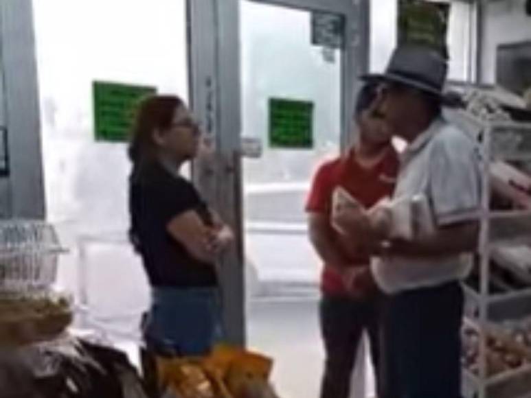En las imágenes captadas por su compañera se observa al hombre cargando algunos productos de la tienda y al fondo a un joven que se desempeña como empleado de la carnicería, mientras que Alma, con una postura firme le pide que se marche.