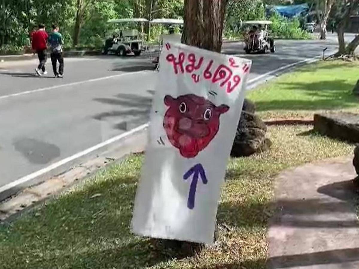 Los carteles con la cara de Moo Deng guían a los turistas hacia su lugar en el zoo, donde la espera para ver a la estrella es interminable.