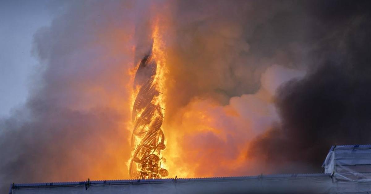 Columnas de humo se elevan desde el histórico edificio de la bolsa de valores de Boersen, que está en llamas en el centro de Copenhague, derribando la emblemática aguja del edificio histórico frente a horrorizados y Testigos emocionales.