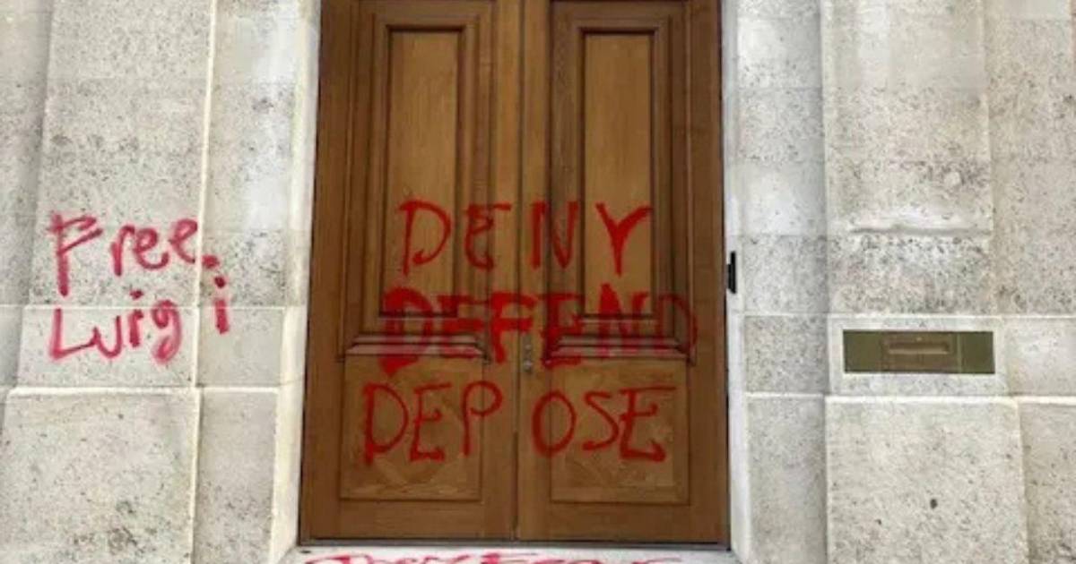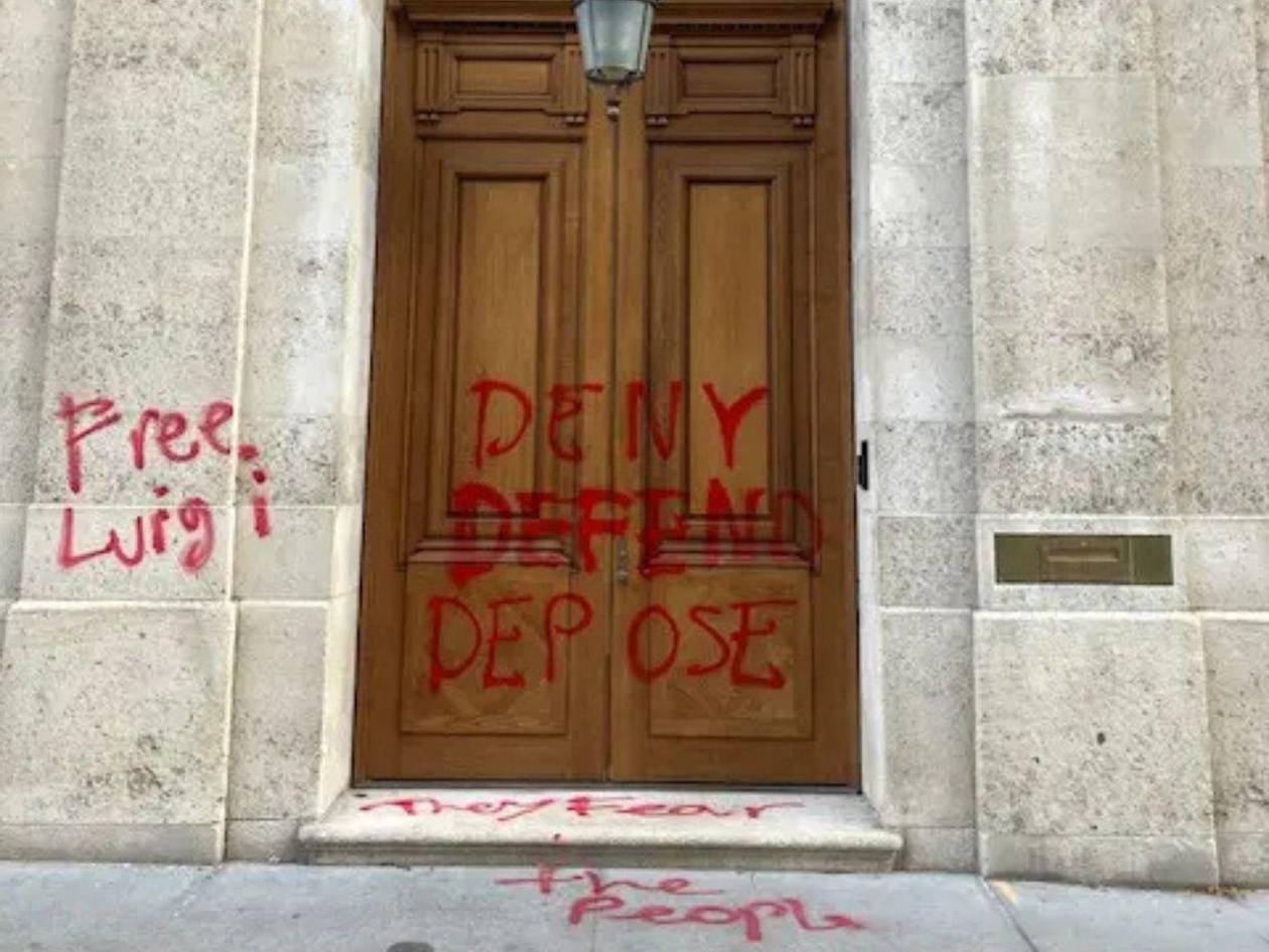 Según el New York Post, en la madrugada del viernes, la fachada del inmueble apareció cubierta con mensajes en aerosol rojo que incluían las frases “Deny, Defend, Depose” y “Free Luigi”. Estas consignas están vinculadas a Mangione, quien las había inscrito en las balas utilizadas en el crimen.