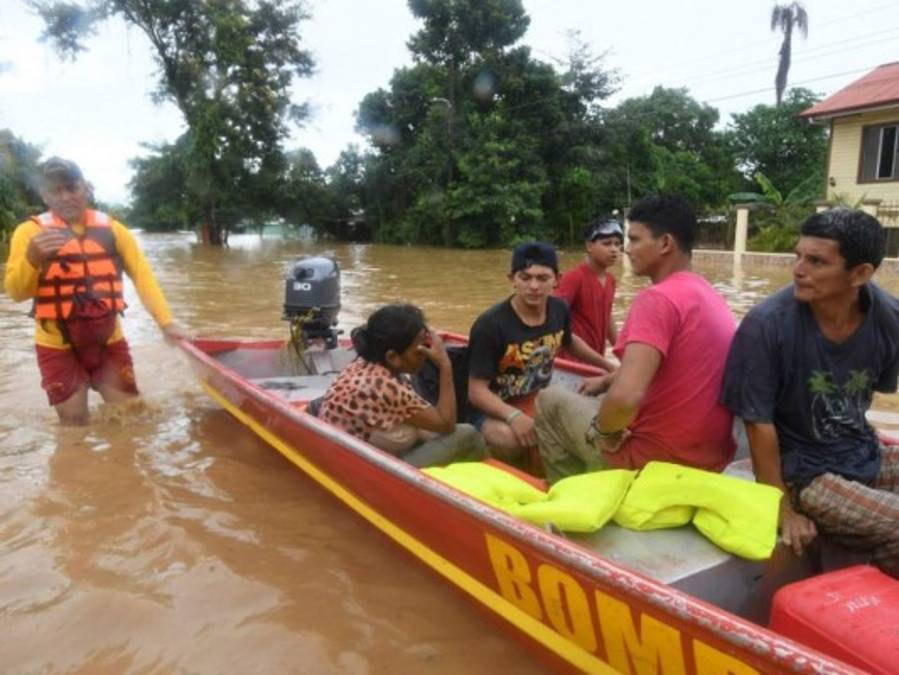 Una familia completa es rescatada en una lancha por parte de los Bomberos, atrás dejan abandonadas sus pertenencias. Foto: Bomberos de Honduras. 05/11/2020 - 00:0014 / 17 -