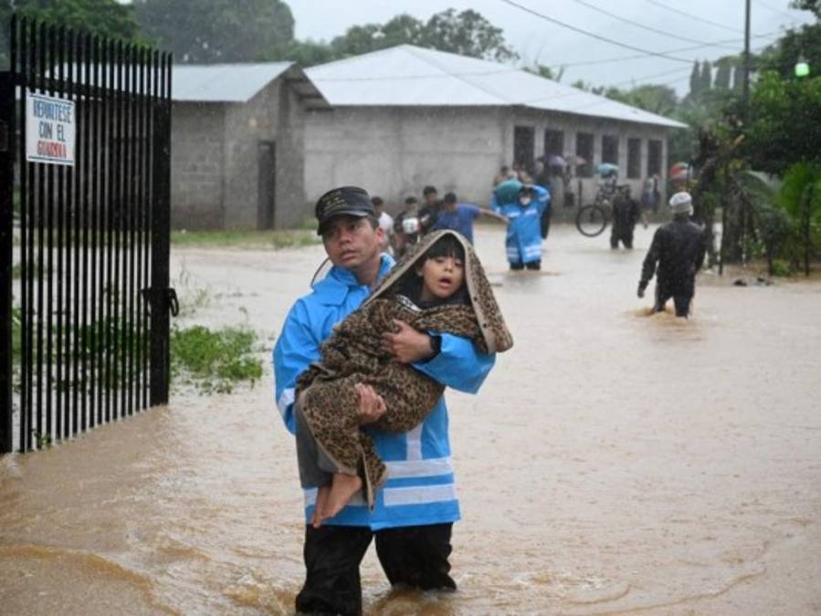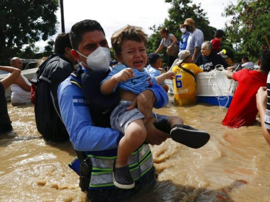 Un miembro de la Policía Nacional rescatan a un niño en el barrio Alemania, que fue inundado por el desborde del arroyo La Arenera, debido a las fuertes lluvias provocadas por el huracán Eta, ahora degradado a tormenta tropical, en la ciudad de El Progreso, departamento de Yoro. Foto: AFP. 05/11/2020 - 00:002 / 17 -