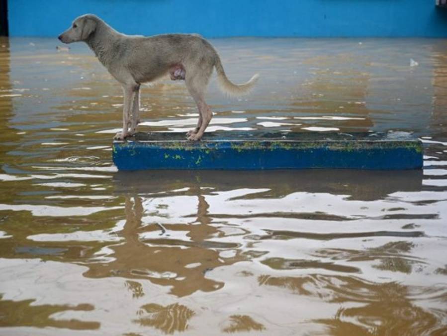 Un perro permanece en un banco de concreto luego del desborde del río Ulúa en el municipio de El Progreso, Yoro. Los animales también son víctimas vulnerables durante esta emergencia por Eta.Foto: AFP. 05/11/2020 - 00:005 / 17 -