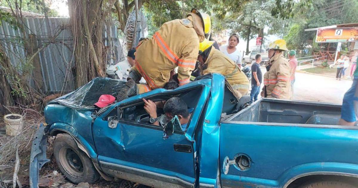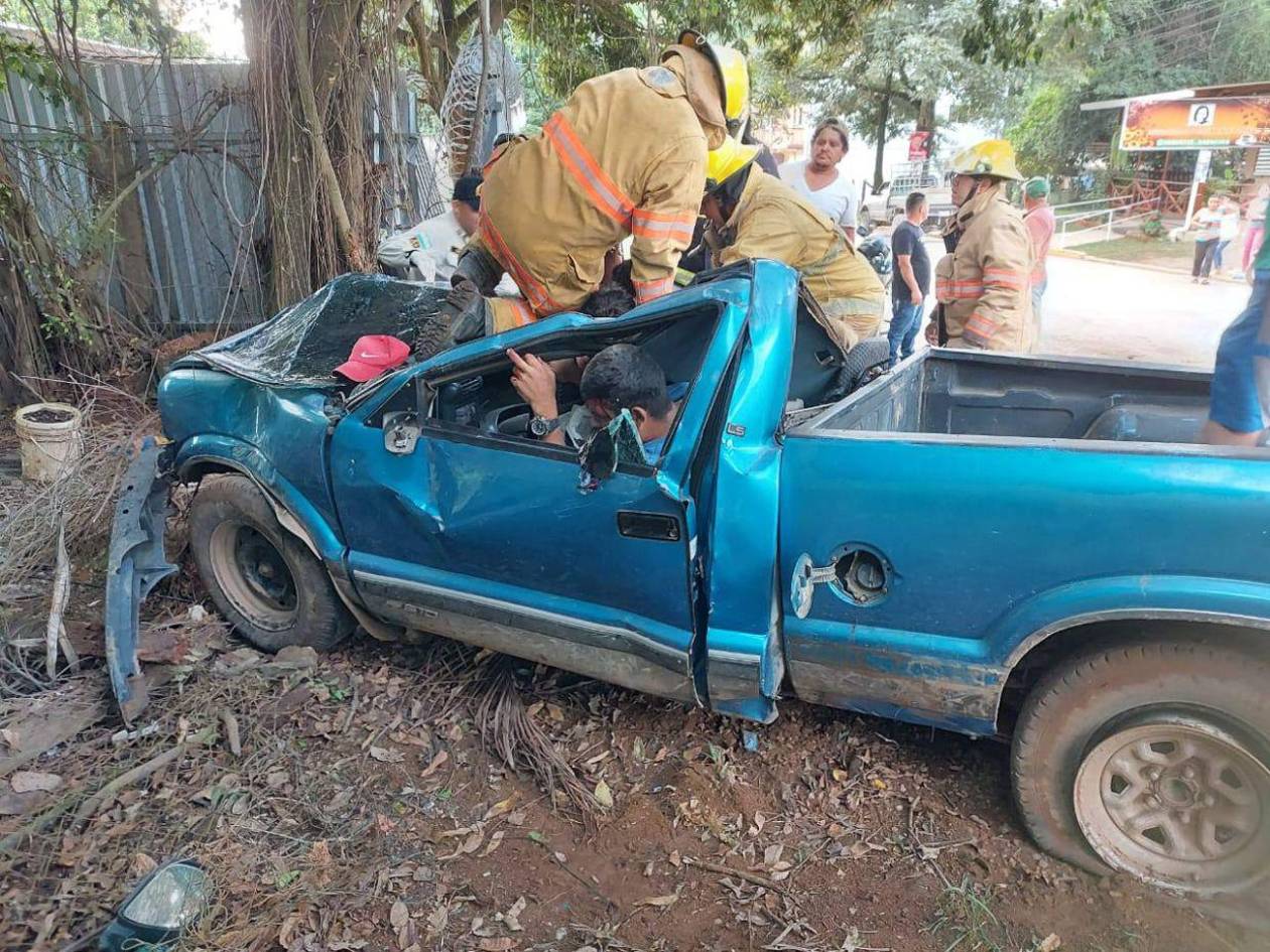 Tres personas quedaron atrapadas dentro de un vehículo tipo pick-up luego de sufrir un brutal accidente de tránsito en el barrio El Campo del municipio de Catacamas, departamento de Olancho.