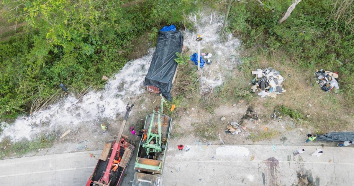 La tragedia se intensificó por el desprendimiento del contenedor de cianuro, que cayó sobre un bus tipo coaster que trasladaba pasajeros.