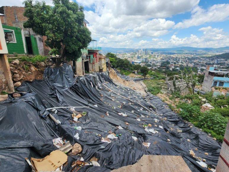 Las grandes extensiones de plástico es lo único que ha quedado en la zona del hundimiento que sufrió la colonia Guillén en 2022 ante las fuertes lluvias que azotaron al país ese año.