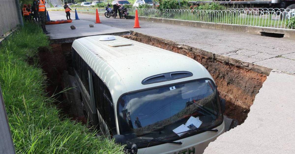 Un enorme socavón se “tragó” un autobús de una universidad, la mañana de este sábado en la capital de Honduras. Estas son las imágenes del hecho que mantiene preocupados a los vecinos de la zona.