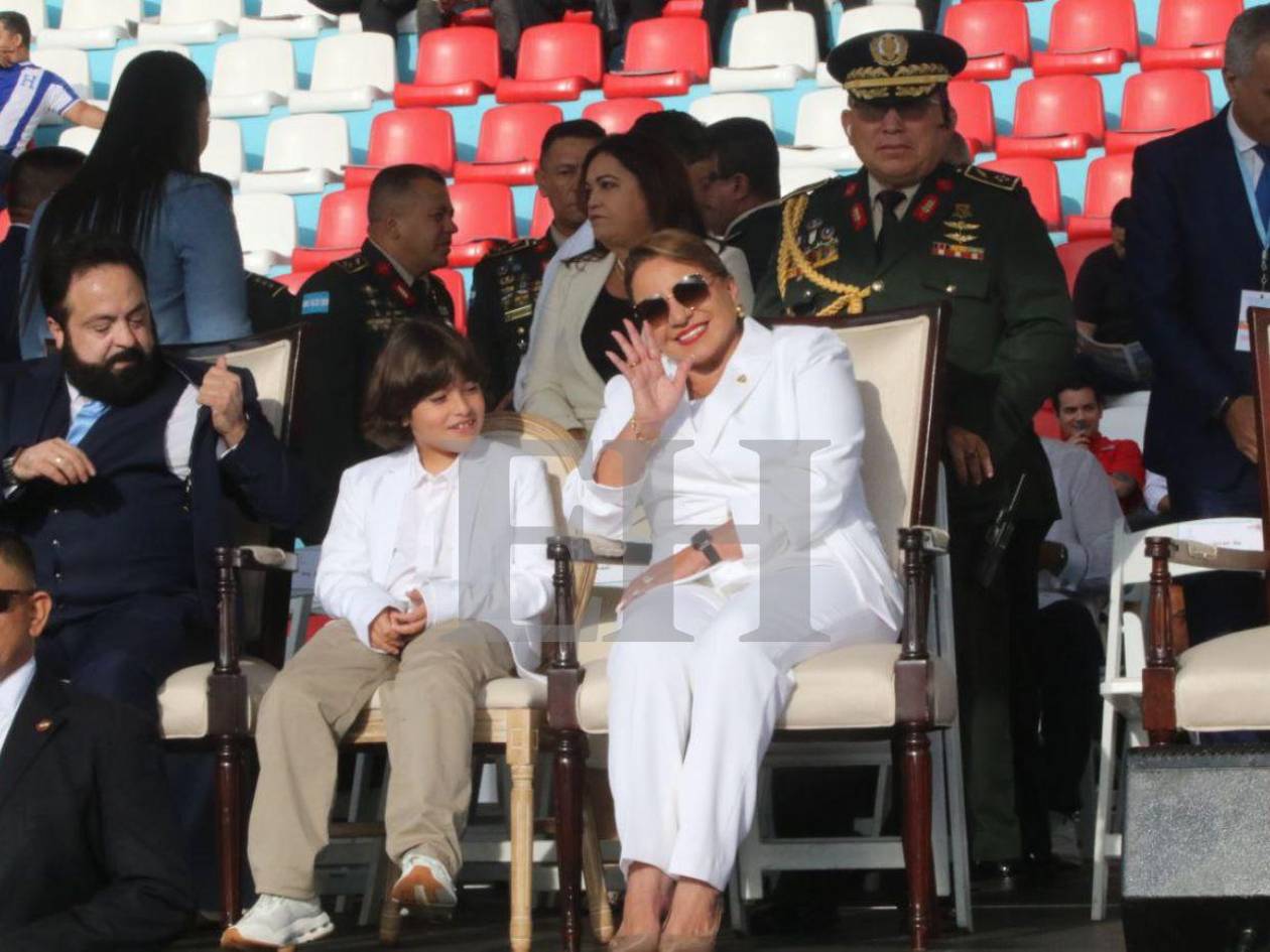 La mandataria entró al recinto acompañada por su hijo, Héctor Zelaya, y por su nieto, quienes ingresaron junto a ella en medio de la expectación de los asistentes. Cabe destacar que la presidenta no participó en el tradicional grito de independencia celebrado en el Parque Central, por lo que su presencia en el Estadio Nacional se convirtió en su primera intervención oficial de la jornada de independencia.