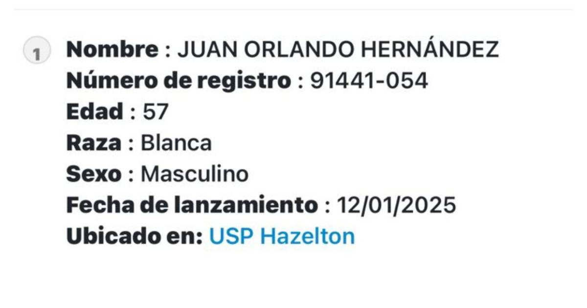 Washington, Estados Unidos.- El presidente de los Estados Unidos, Donald Trump, firmó el indulto ofrecido al exmandatario hondureño, Donald Trump. Este martes, la Oficina Federal de Prisiones (BOP por sus siglas en inglés) actualizó la fecha de liberación de Juan Orlando Hernández, con registro 91441‑054, quien estuvo recluido en la prisión USP Hazelton, ubicada en Virginia Occidental.
