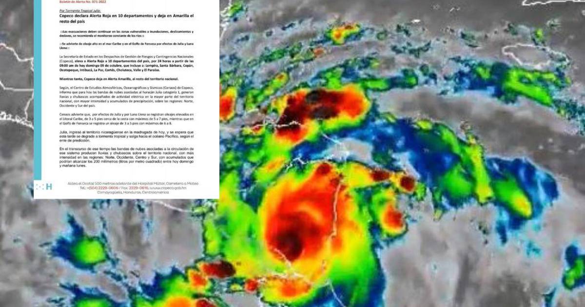 TEGUCIGALPA, HONDURAS.- La Secretaría de Gestión de Riesgos y Contingencias Nacionales (Copeco) elevó este domingo -09 de octubre- alerta roja para 10 departamentos del país, mientras que los demás se mantendrán en alerta amarilla.