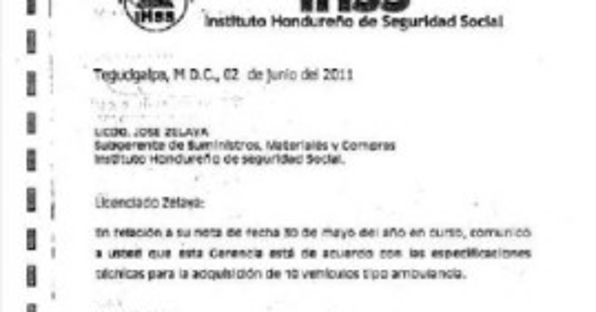 “En relación a su nota de fecha 30 de mayo del año en curso, comunico a usted que esta Gerencia está de acuerdo con las especificaciones técnicas para la adquisición de 10 vehículos tipo ambulancia”, cita la nota, sin número, que envió Bertetty a Zelaya.