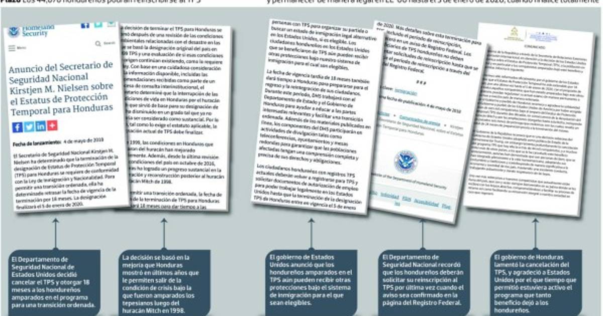 Isaías Barahona, vicecanciller de Honduras, explicó en un comunicado que “hemos sido informados oficialmente por el gobierno de los Estados Unidos que el Estatus de Protección Temporal ha sido extendido por 18 meses, por una última vez hasta el 5 de enero de 2020, con el propósito de que todos los compatriotas puedan regularizar su actual estatus de manera permanente o retornen a nuestro país de manera ordenada”.