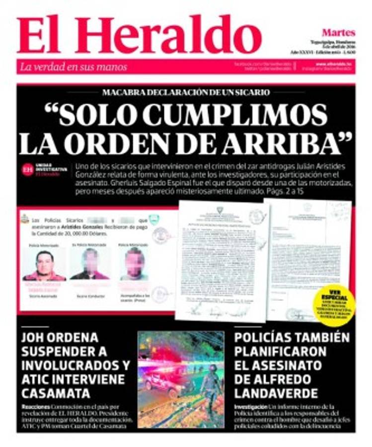De igual manera, EL HERALDO denunció que los informes SEDS-IG-1106-2011 y SED-IG-0167-2012, de la Inspectoría General de la Policía Nacional, relevaron que oficiales de la Policía ordenaron en 2011 la muerte del exasesor de la DLNC, Alfredo Landaverde.