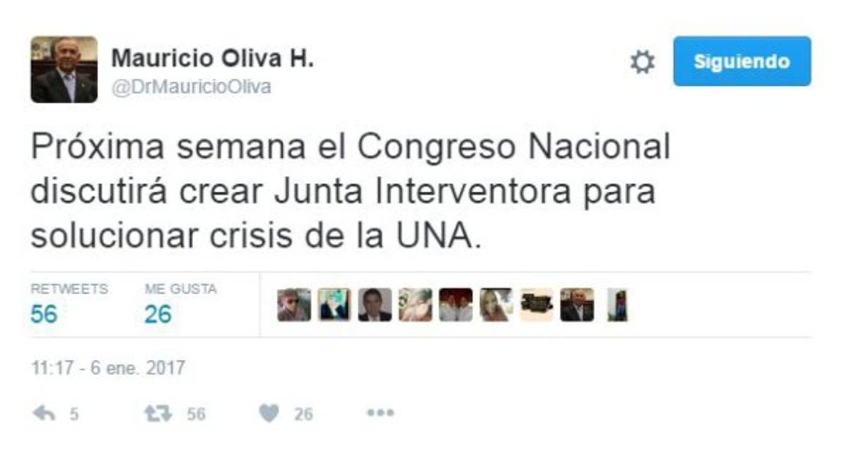 El presidente del Congreso Nacional, Mauricio Oliva, anunció este viernes que el pleno del Legislativo aún considera nombrar una Junta Interventora para resolver la crisis a lo interno de la Universidad Nacional de Agricultura (UNA).