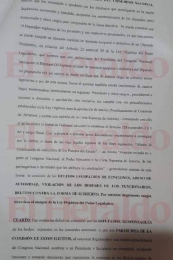 En el documento se solicita a los fiscales del Ministerio Público emitir un requerimiento fiscal contra los parlamentarios por los supuestos delitos de usurpación de funciones, abuso de autoridad, violación de los deberes de los funcionarios y delitos contra la forma de gobierno.