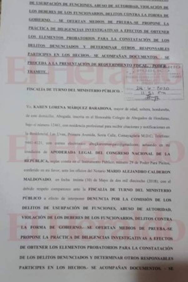 La apoderada legal del Congreso, Karen Lorena Márquez, instó a la Fiscalía a 'proceder a realizar cuantas diligencias investigativas sean necesarias para la constatación de los delitos denunciados y una vez finalizadas las diligencias investigativas, que la Fiscalía instructora proceda a presentar el correspondiente requerimiento fiscal en contra las personas individualizadas como responsables de los delitos'.