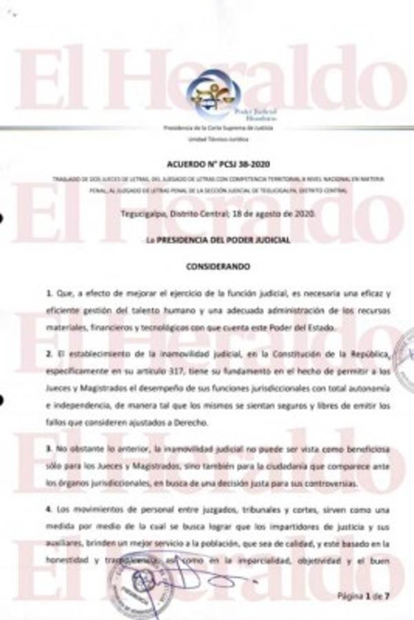 Mediante el acuerdo PCSJ38-2020, el presidente de la CSJ, Rolando Argueta, autorizó el traslado de dos jueces asignados a los Juzgados de Letras Penal con Jurisdicción Nacional que conocen acusaciones de alto impacto a una jurisdicción ordinaria en materia penal.