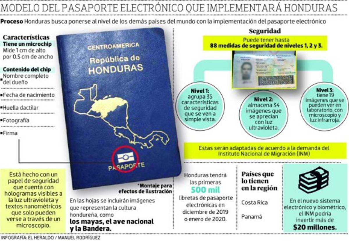 Y por último está el pasaporte electrónico, es decir, incorporar el microchip que reúne una serie de medidas de seguridad que permiten un mayor control migratorio por los aeropuertos, terminales y puertos de Honduras y el mundo.