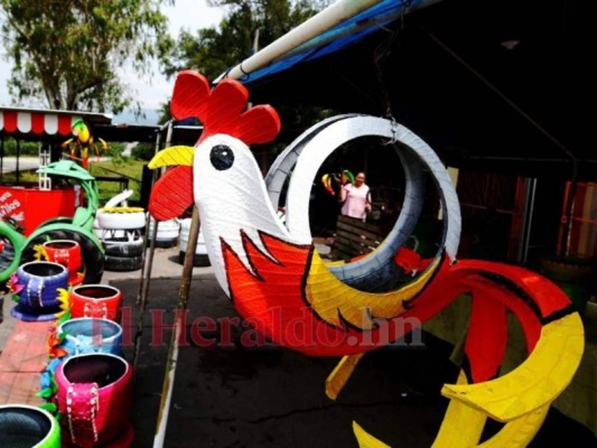Ante la falta de empleo y la desesperación por llevar alimentos a su familia, a don Natividad Rivas se le despertó la chispa de la creatividad y surgió la idea de hacer figuras con llantas. Desde aves como tucanes y gallos hasta vistosas ranas y flores son parte de los productos de su exhibición.