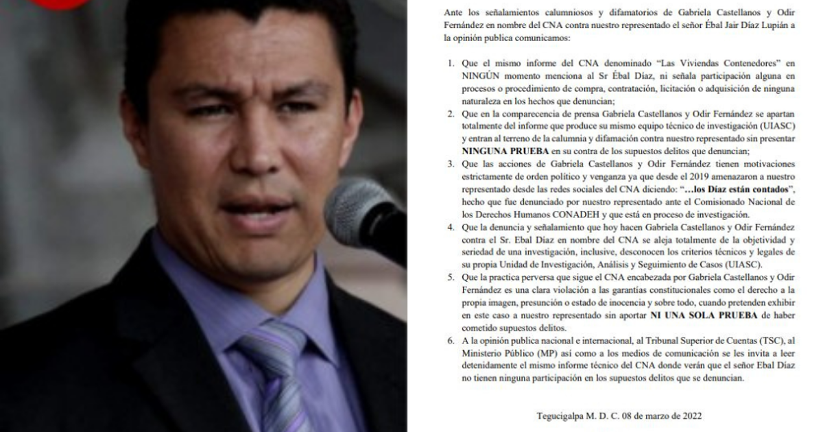 Ante los señalamientos calumniosos y difamatorios de Gabriela Castellanos y Odir Fernández en nombre del CNA contra nuestro representado el señor Ébal Jair Díaz Lupián a la opinión pública comunicamos: