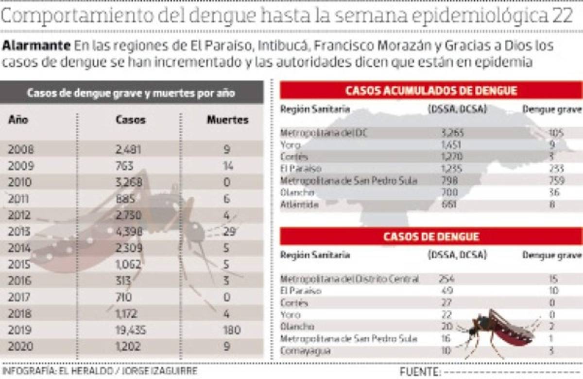 Mientras que las regiones con más casos acumulados de dengue grave son: la Metropolitana de San Pedro Sula con 759 casos, El Paraíso con 233, la Metropolitana del Distrito Central con 105, Olancho con 36, Choluteca con 19 y Comayagua con 10 casos.