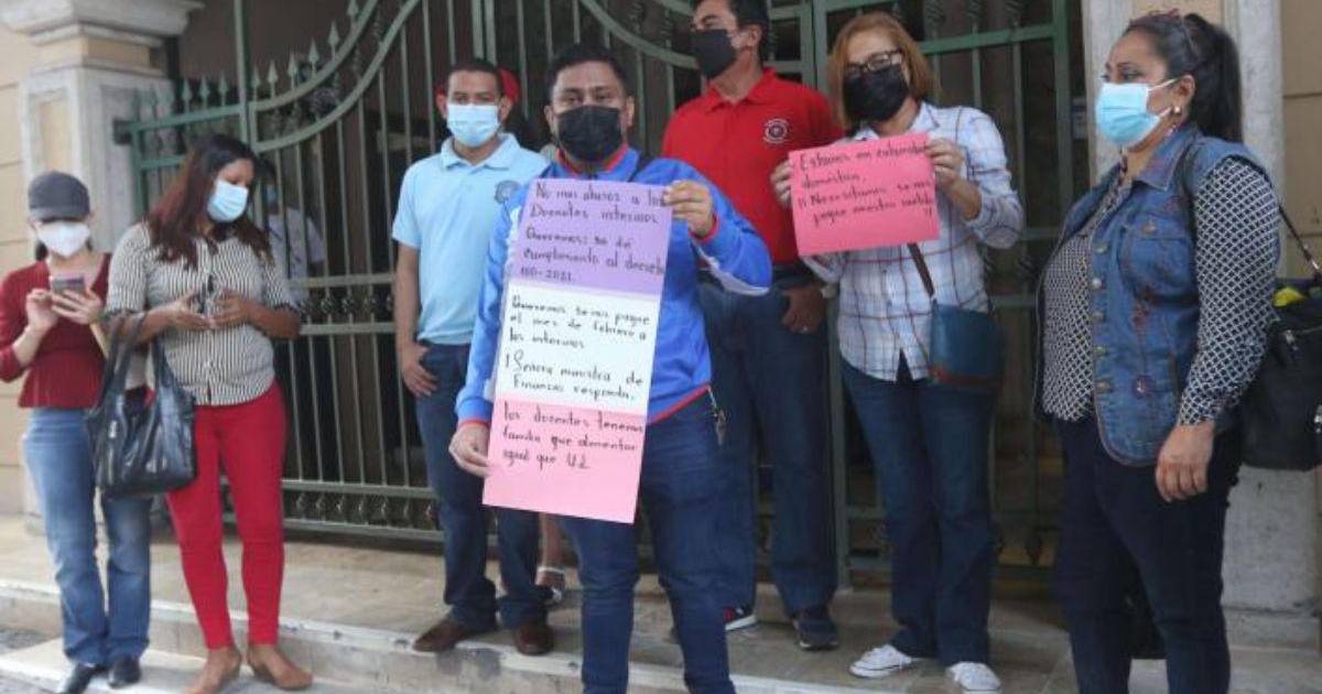TEGUCIGALPA, HONDURAS.- Un grupo de maestros se apostó frente a la Secretaría de Finanzas para exigir a las autoridades el pago de la deuda histórica que se tiene con el sector magisterial desde el 2012.