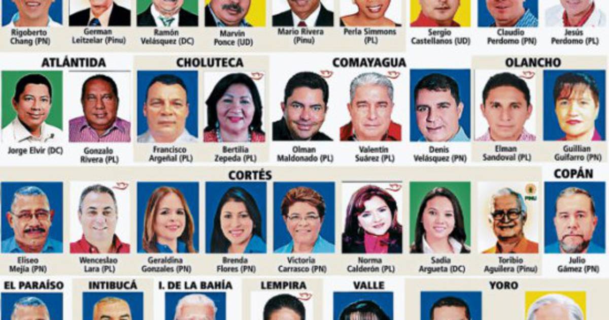 Entre los diputados propietarios 46 pertenecen al Partido Nacional, 28 al Partido Liberal, 4 a la Democracia Cristiana; 4 a Unificación Democrática y 3 al Partido Innovación y Unidad.