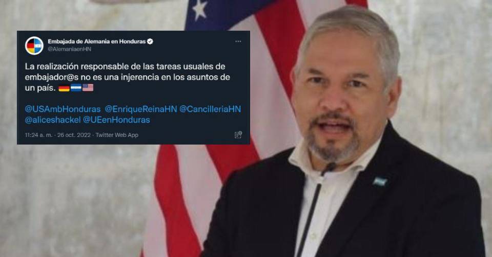 TEGUCIGALPA, HONDURAS.-La Embajada de Alemania en Honduras envió, a través de Twitter, un mensaje al canciller hondureño Enrique Reina después de que el diplomático dijera que las declaraciones de la embajadora Laura F. Dogu, quien señaló la preocupación de EE UU por el mal trato a inversionistas y la corrupción del gobierno, son injerencia.
