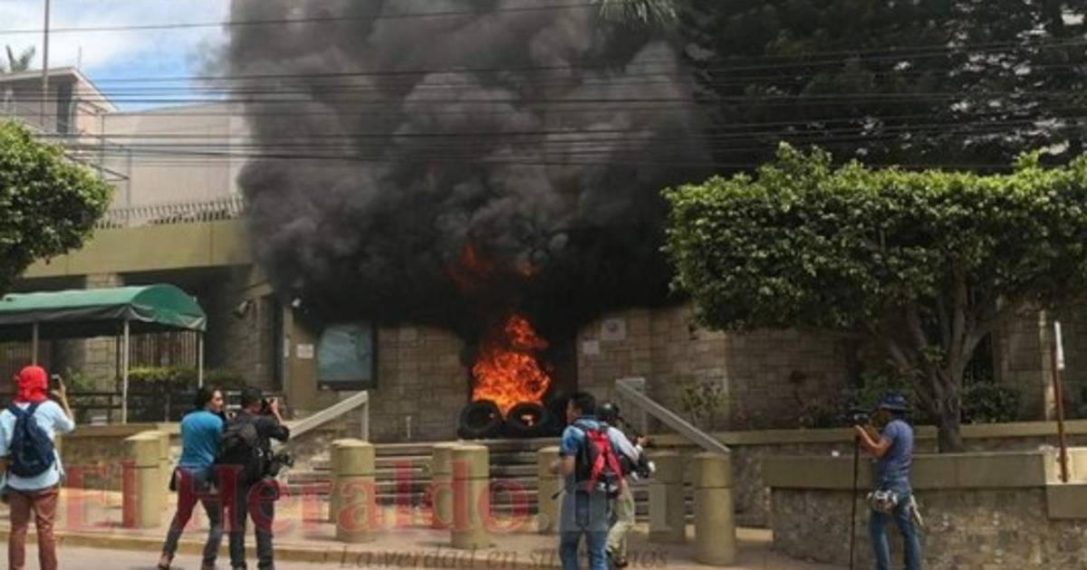 El pasado 31 de mayo, sujetos encapuchados que participaban en las marchas de los gremios de la salud y la educación en la capital le prendieron fuego a uno de los portones de acceso a la embajada norteamericana, en donde colocaron llantas y luego las incendiaron.