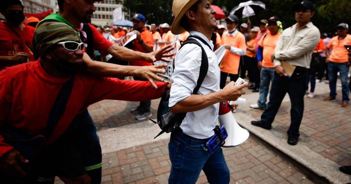 TEGUCIGALPA, HONDURAS.- A empujones fue sacado de la Plaza Central un hombre que con altavoz en mano gritaba consignas en medio de la ceremonia que celebraban por motivo del Día del Trabajador.