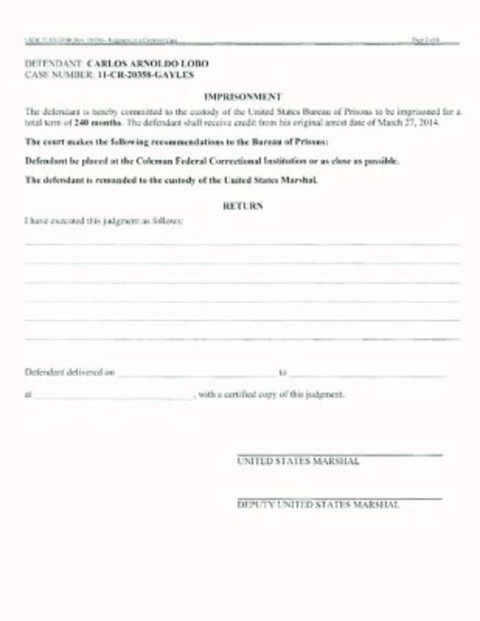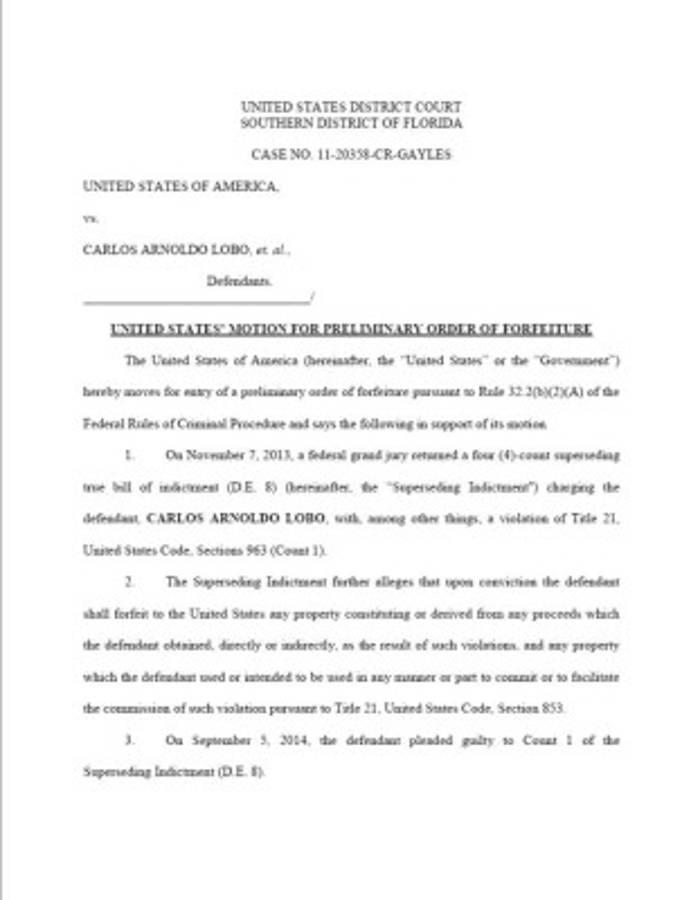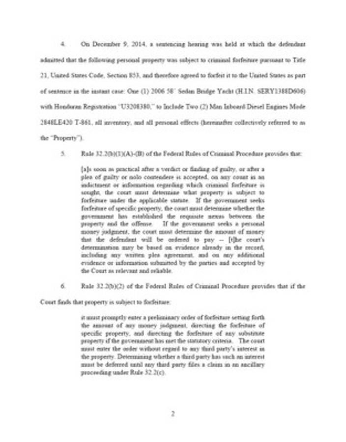 El 5 de septiembre de 2014, el acusado se declaró culpable de los cargos y el 9 de diciembre reciente, la justicia norteamericana lo sentenció a 20 años de prisión y a la entrega del yate Sedan Bridge (HIN SERY1388D606) con registro de Honduras U3208380, diésel motor 2848LE420 T-861.