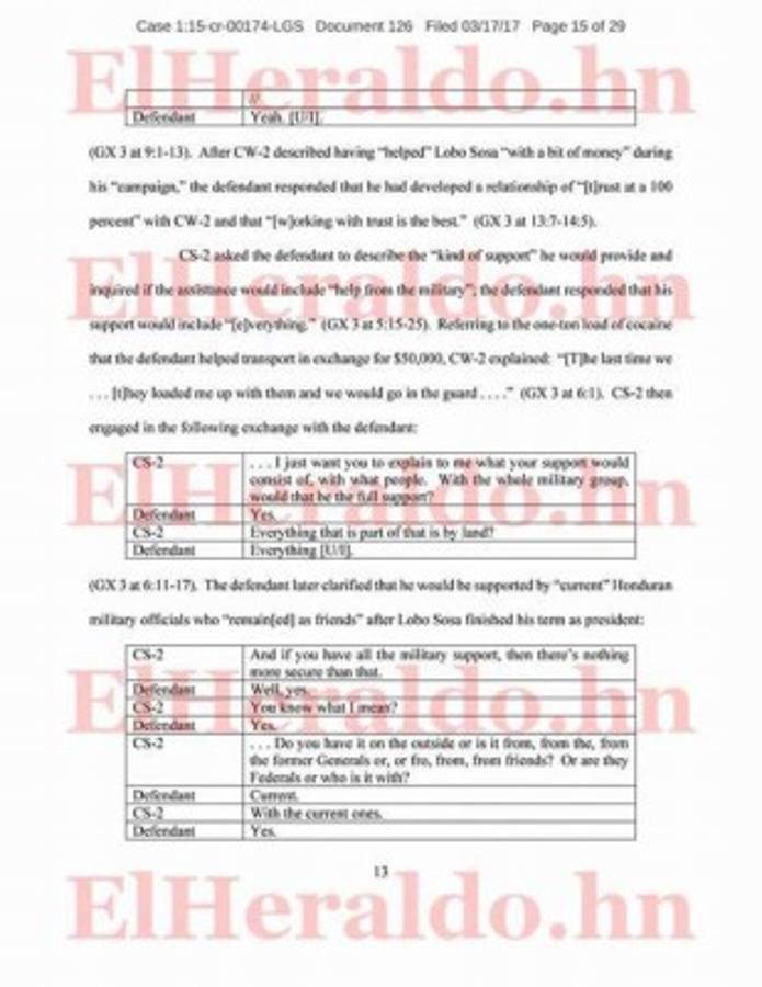 Durante la reunión, los dos supuestos narcos enviados por “El Chapo” explicaron que el cargamento de cocaína estaba dirigido a Nueva York y que se enfrentaban a la presión del tiempo para cruzar a Estados Unidos, por lo que querían “una ruta controlada al máximo” y que esperaban tener apoyo separado del “lado de la inteligencia hondureña”, en referencia a los “esfuerzos” que Lobo estaba haciendo, “incluyendo la anticipada introducción al “General de Inteligencia”, es decir, al general Pacheco”.