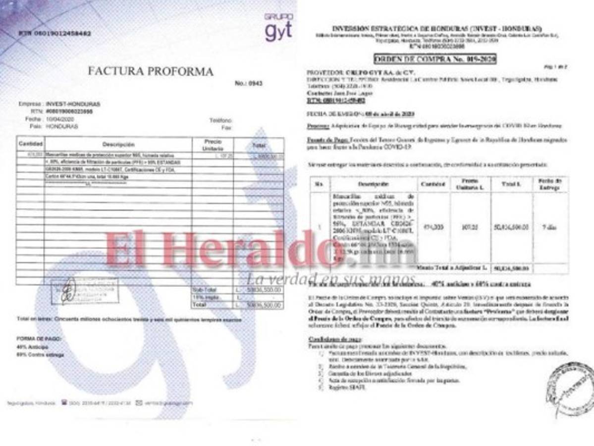 Así lo señala la orden de compra No. 019-2020 y la factura proforma No. 0943 del 13 de abril de este año.