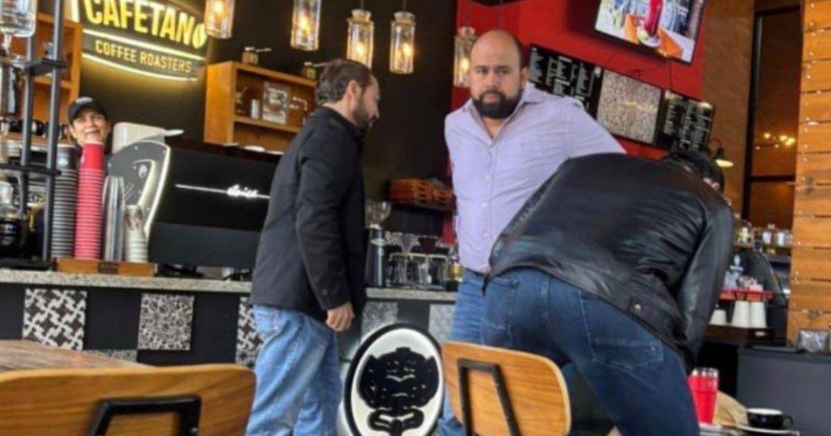 En la imagen se observa al jefe de la bancada de Libre, Rafael Sarmiento, vestido con camisa morada, de pie frente a la barra de un café capitalino. A su lado aparece Yuri Sabas, con chumpa negra, diputado propuesto por el excandidato presidencial Salvador Nasralla para asumir la presidencia del Congreso Nacional. De espaldas, participando del mismo encuentro, se identifica al diputado Rasel Tomé.