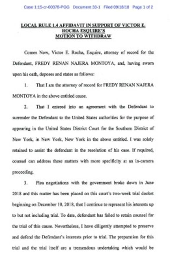 Una declaración jurada remitida por Rocha a la Corte Federal del Distrito Sur de Nueva York, a la que EL HERALDO tuvo acceso, establece que el demandado no ha proporcionado los recursos necesarios para preparar el juicio que se desarrollará en diciembre.