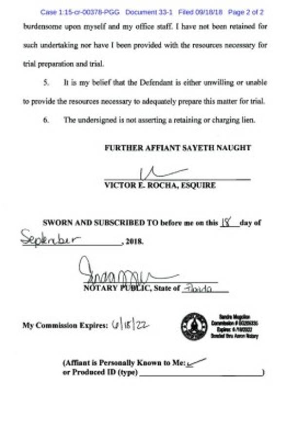 “Las negociaciones de culpabilidad con el gobierno fracasaron en junio de 2018 y este asunto se ha incluido en el expediente de prueba de dos semanas de este tribunal que comienza el 10 de diciembre de 2018, y sigo representando sus intereses, pero sin incluir el juicio”, explica.