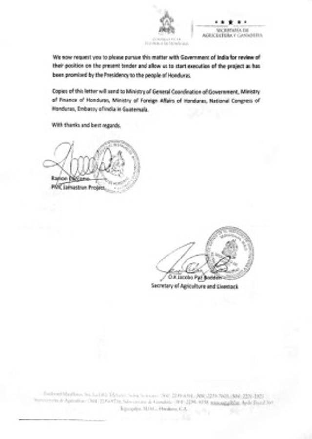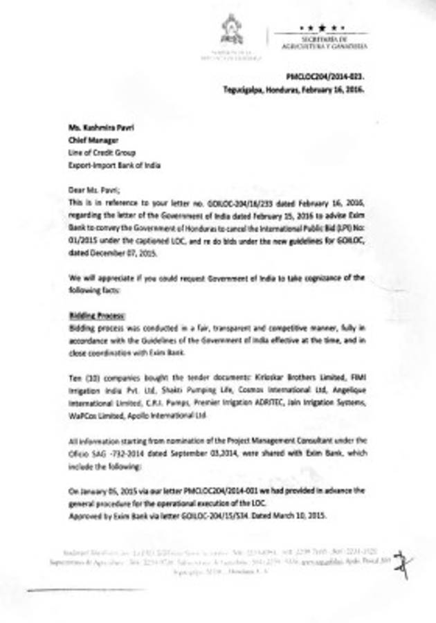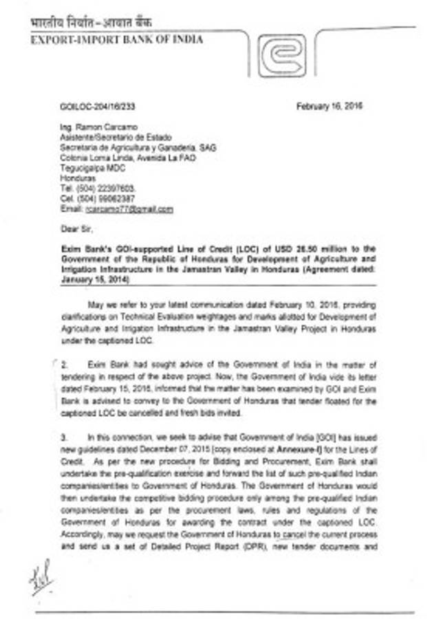 “En consecuencia solicitamos al gobierno de Honduras cancelar el proceso actual y nos envíe un conjunto del Informe Detallado del Proyecto (DPR), nuevos documentos de licitación y criterios de precalificación para nuestro examen, luego de lo cual el Exim Bank emprenderá el ejercicio de precalificación entre las empresas de la India”.