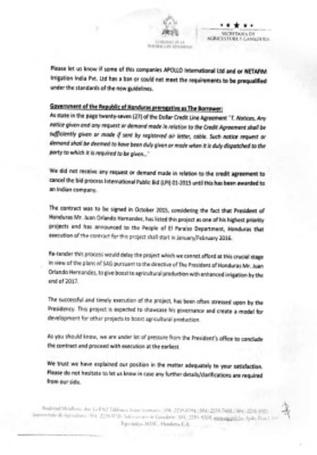 Según él, reofertar el proceso retrasaría el proyecto, lo cual “no podemos permitir en esta crucial etapa en vista de los planes de la SAG, de conformidad con las directrices del presidente de Honduras para aumentar la producción con irrigación mejorada para finales de 2017. “Como usted ya debe saber estamos bajo mucha presión por parte de la oficina del Presidente para concluir con el contrato y proseguir con la ejecución lo más temprano posible”.