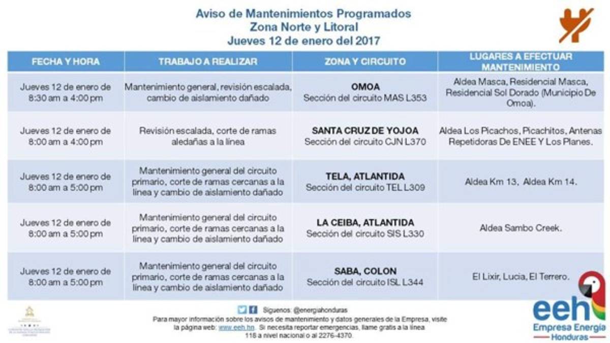 Las autoridades de la Empresa Energía Honduras (EEH) anunciaron las interrupciones en el servicio de energía eléctrica debido a trabajos de mantenimiento general.
