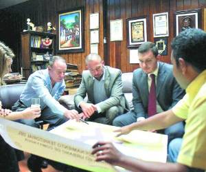 El alcalde Carlos Miranda cuando revisaba los planos del proyecto junto a los concesionarios. 1 Socializan el área comercial de aeropuerto Palmerola